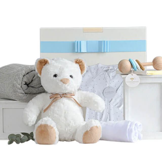 Welcome a little boy to the world with this luxurious baby hamper. Packed full of a beautifully crafted blanket from Sheridan, a Beechwood Rattle, and the most adorable Sheridan Sebastian Bear, it gives the new family gorgeous memories to cherish. It's perfect for baby showers, christenings, and visits.