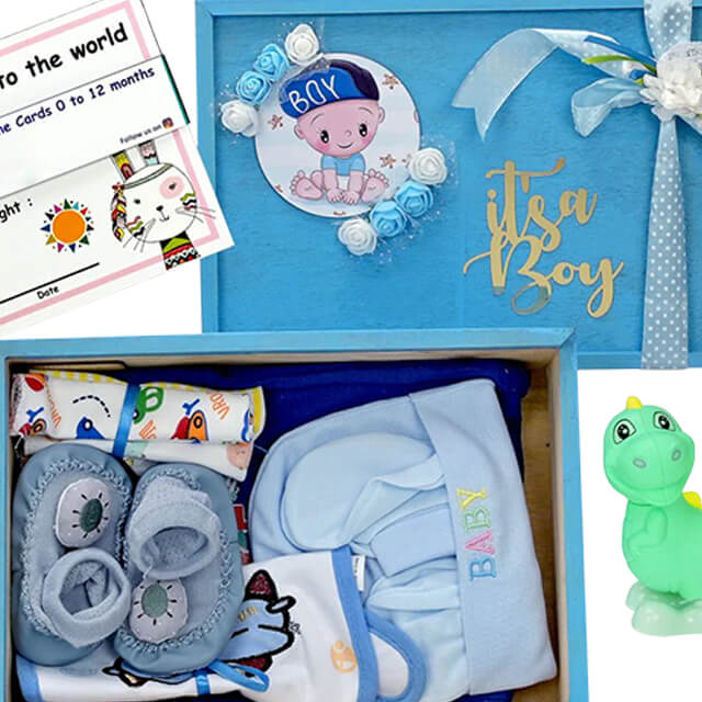 1 baby suit, 1 Pinewood Storage Box, 1 Newborn Cap, 1 Pair of Mittens, 1 Pair of Booties, 1 set of 24 Baby Milestone Cards (0-12 months) extremely useful for photo shoot of baby's milestones, 3Attractive Bath Toys, 1 Feeding Bib, 4 Extra soft Napkins.