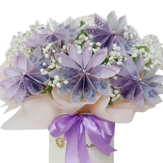 Buket uang dengan rangkaian berbentuk 5 tangkai bunga uang.